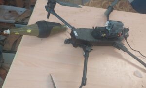This image shows a one-way-attack (‘sacrificial’) UAV with the apparent warhead broken off. It is believed to have been attached to the grey mechanism located at the rear of the UAV, likely separating when the UAV was downed. (ARES)
