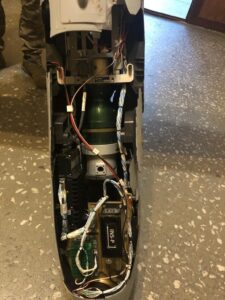 This image shows a remnant of a JDAM tail kit that was paired with a MK 84 2,000-pound-class air-delivered bomb. The CAGE code (“OUVG2”) for Aeroantenna Technology, an American manufacturer of GPS components for guidance systems, is visible on the wiring. (ARES)
