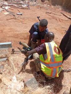 In this image, part of the distinctive internal 'X-rib' arrangement is visible protruding from the base of an M825-series white phosphorus smoke projectile. This is a useful diagnostic feature that can be used to distinguish remnants of these munitions from those of similar projectiles (such as those using a hexachloroethane/zinc smoke composition) if markings are not visible (ARES)