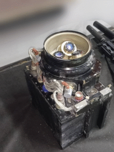 This image shows a close up view of an actuator assembly from an AGM-114 ‘Hellfire’ series missile. This assembly is what actuates the control fins, and the attachment point for one of the control fins is visible at the bottom right of the image. This assembly belongs to the control section, which is the rearmost section of the missile. (ARES)