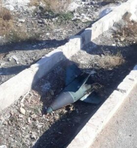As with several other images in the OSMP database, the text on this image was added by a social media user prior to its inclusion herein. Rather than a “rocket” as described in the annotation, this image actually shows an air-delivered bomb. (ARES)