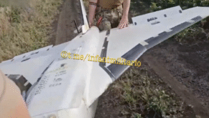 A Gerbera-series UAV is pictured here being carried by just two Ukrainian soldiers. This highlights the Gerbera’s lightweight design—the airframe is mostly constructed from Styrofoam and wood, which saves on both weight and cost. This particular example does not bear signs of significant damage, suggesting that it either malfunctioned or was brought down by EW and crashed. (ARES)