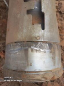 This image shows an Iranian 122 mm high explosive (HE) artillery gun projectile. Like several other munitions, it is described in Iranian sources—and, in this case, on the munition itself—only by reference to the weapon with which it is most often associated: the Soviet-designed 122 mm D-30 howitzer (often rendered ‘D30’, without the hyphen, in Iranian service). This munition is also marked to indicate it was produced in 2023. Interpreting munitions markings in this way, especially where they indicate recent manufacture, may provide evidence of ongoing supply during a conflict. (ARES)