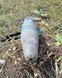 This image shows a fragment of the wing assembly of a Paveway bomb guidance kit. The data plate, though damaged, provides additional information about the munition. A partial Commercial and Government Entity code (CAGE; “ …14”), manufacturing part number (MFG SKU; “872127-1”), National Stock Number (NSN; “...5-01-141-5890”), serial number (Serial NO; 15-005326), and date of manufacture (“…MFR. 10/15”) are visible. This data can be used to look-up the component and determine that this specific fragment is from a Paveway II guidance kit intended for use with a MK 82-series 500-pound-class air-delivered bomb. This bomb and guidance kit combination is referred to as the GBU-12. The CAGE code, although partial, is enough to determine that this specific kit was produced by Raytheon, rather than the other known manufacturer of the Paveway kits, Lockheed Martin. (ARES)
