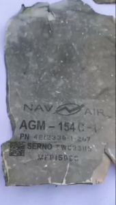 The AGM-154 Joint Standoff Weapon (JSOW) is a guided air-delivered ‘glide bomb’ that allows for long-range strikes using an unpowered munition. The AGM-154C and AGM-154C-1 variants (a remnant of the latter pictured here) carry a Bomb Royal Ordnance Augmented Charge (BROACH) multi-stage warhead which uses a WDU-44 shaped-charge warhead as its first stage, to help penetrate hardened targets, whilst the WDU-45 second stage comprises a conventional high explosive penetrator warhead (also called a ‘follow-through’ warhead). The AGM-154C-1 is described by the U.S. Navy as their “first air-to-ground Network-Enabled Weapon (NEW) capable of attacking stationary land and moving maritime targets. It includes GPS/INS guidance, terminal IR seeker and a Link 16 weapon data link. Integration of the Link-16 weapon data link and updated seeker software algorithms provide a capability against at-sea moving/relocatable targets.” (ARES)