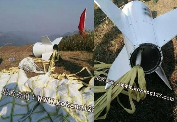 "The tail and parachute of an FAE bomb that was dropped by the Myanmar Air Force during the Kokang offensive and landed on Chinese territory near Myanmar in March 2015."