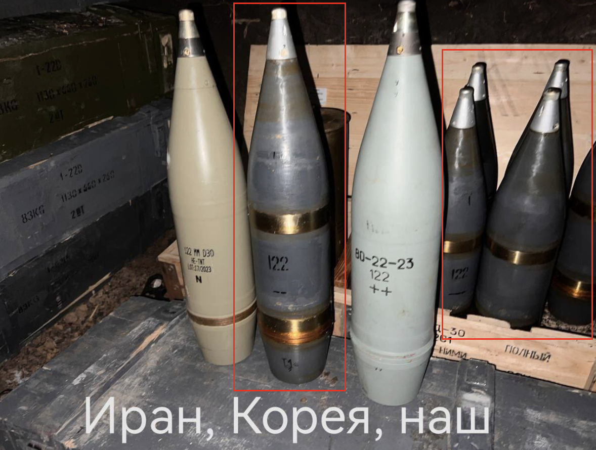 The boxed munition exhibits physical characteristics and markings consistent with production in North Korea. The DPRK has supplied Russia with a variety of munitions, including 122 mm artillery gun projectiles as shown in this image. Packaging visible in the image also bears the hallmarks of North Korean manufacturer. (ARES)