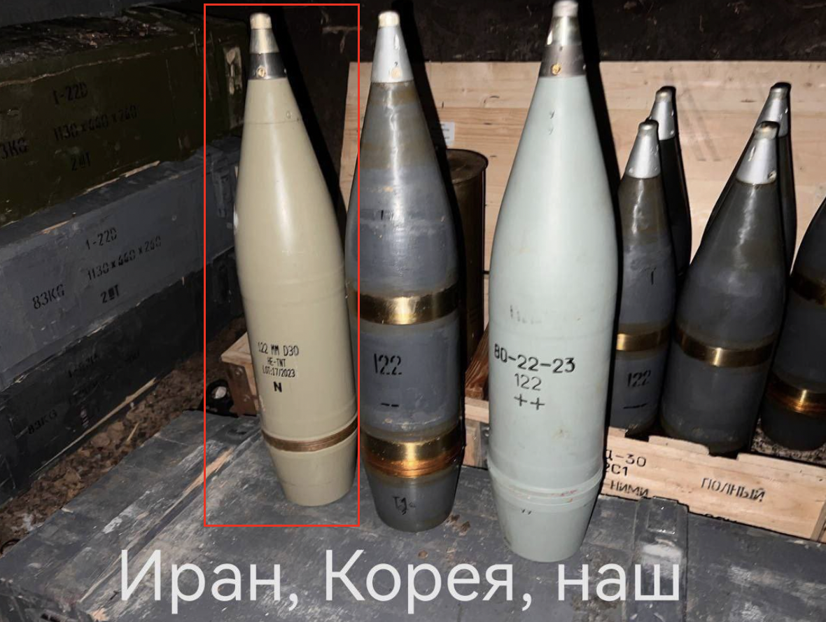 The boxed projectile is an Iranian 122 mm high explosive (HE) artillery gun projectile. Like several other Iranian munitions, it is described in Iranian military and industry sources—and, in this case, on the munition itself—only by reference to the weapon with which it is most often associated: the Soviet-designed 122 mm D-30 howitzer (often rendered ‘D30’, without the hyphen, in Iranian service). This particular example is marked to indicate it was produced in 2023. Interpreting munitions markings in this way, especially where they indicate recent manufacture, may provide evidence of ongoing supply during a conflict. (ARES)