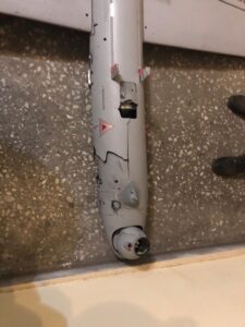 The 57E6 series of missiles fired from the 96K6 Pantsir system use a two-stage design that is unusual for surface-to-air missiles of this type. The remnant seen in this image is part of the missile’s booster section, which accelerates the second stage to a high velocity before separating. The booster section uses a distinctive toffee-brown, filament-wound composite body. (ARES)
