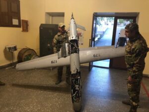 This image shows the remnants of a SkyStriker one-way attack UAV, manufactured by Elbit Systems of Israel. The SkyStriker can be fitted with various warhead options, including dual-purpose warheads weighing 5 or 10 kilograms. While it appears that a reconstruction was attempted with the remnants, the placement of the various components does not accurately represent an intact SkyStriker. (ARES)