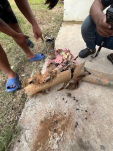 This image shows an M49-series 60 mm high explosive (HE) mortar projectile, or a copy thereof. Due to the state of the round the available imagery, the specific model or variant cannot be determined. The fuze is also not clearly visible. Most M49 mortar projectiles use an M525, M717, M935, or similar point-detonating (PD) fuze. (ARES)